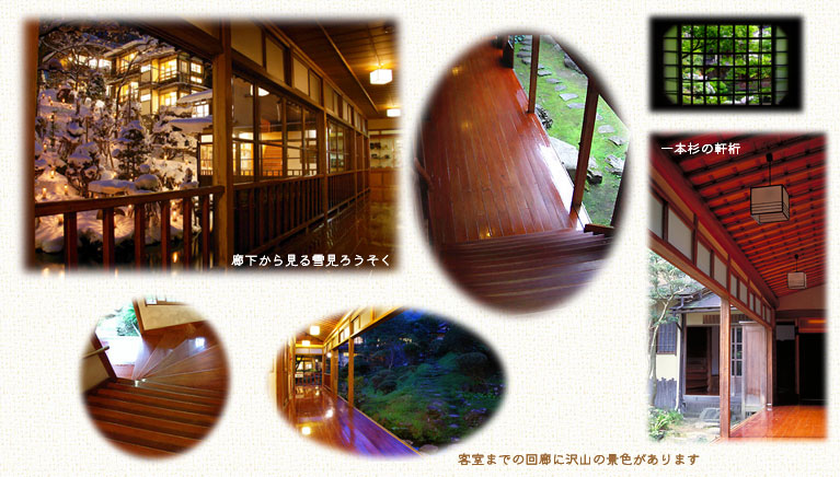 回廊には、数寄屋造りの特徴である材料の素地を生かした、木の美しさを見ることが出来ます。右下の写真に写る軒桁は、節目と割れ目のない良質の長い杉の木を使用しています。